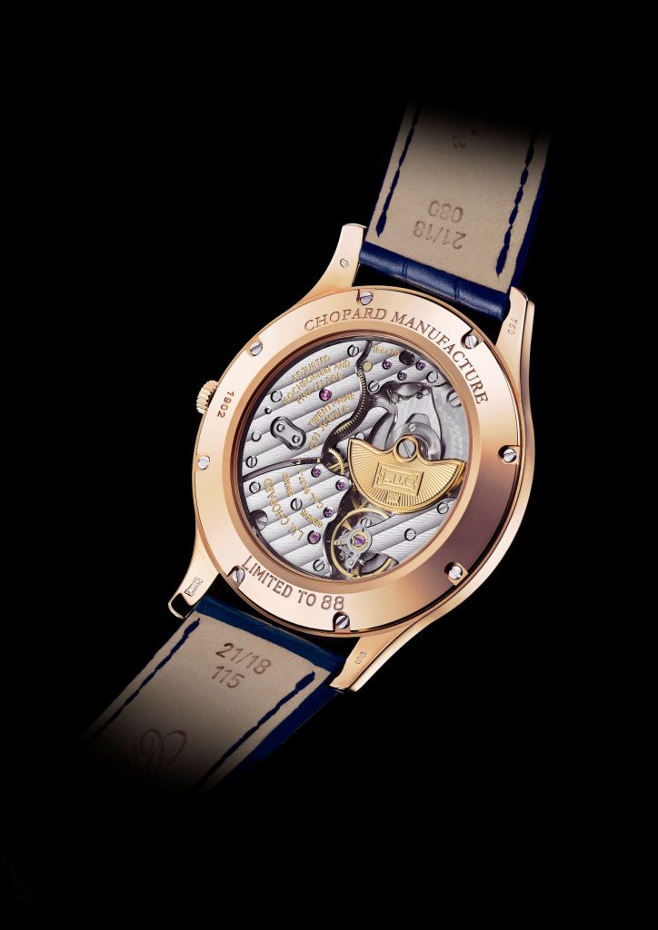 Alojado numa caixa ultrafina, encontra-se o seu movimento L.U.C 96.17-L que comprova a experiência relojoeira dos artesãos das Chopard.