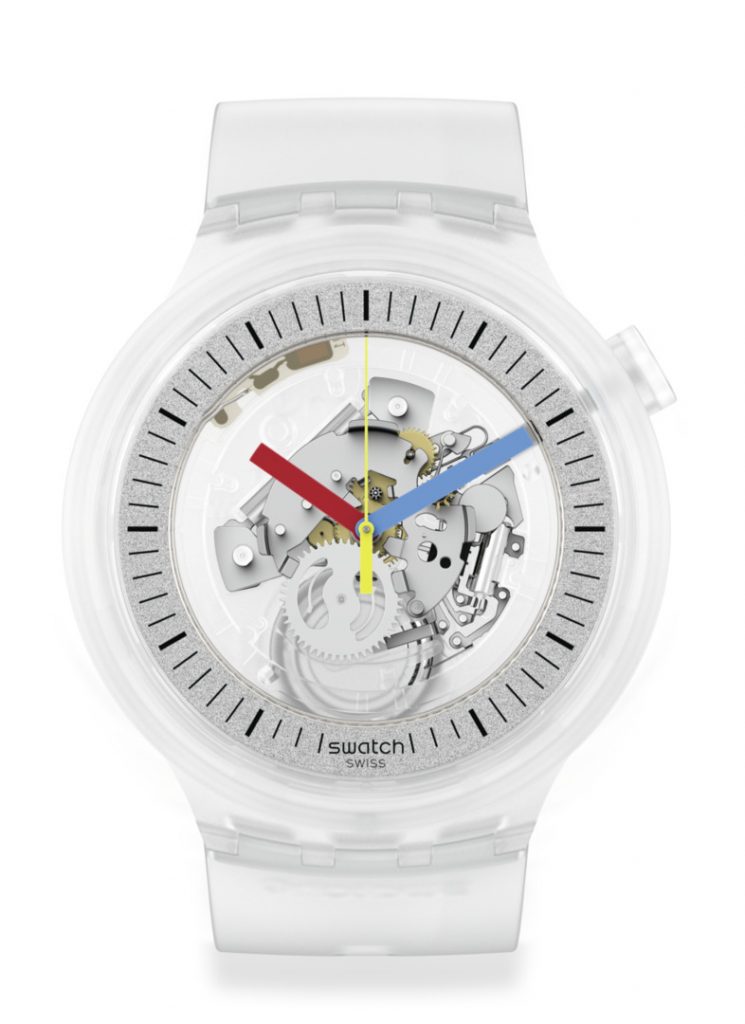 Existe poder na simplicidade, e a Coleção Swatch CLEAR retoma o essencial com uma paleta de cores contrabalançada pelo toque de assinatura da Swatch de ponteiros nas cores primárias (azul, vermelho e amarelo). A Swatch acredita que também há poder em agir de forma responsável e sustentável, com vários estilos da Coleção CLEAR fabricados a partir de materiais de origem biológica.