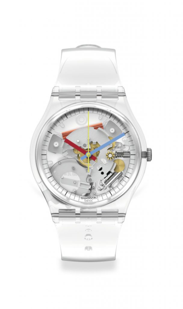 A transparência é uma tendência do momento, mas trata-se de um look instantaneamente reconhecível e emblemático lançado pela Swatch pela primeira vez em 1985, num modelo Gent.