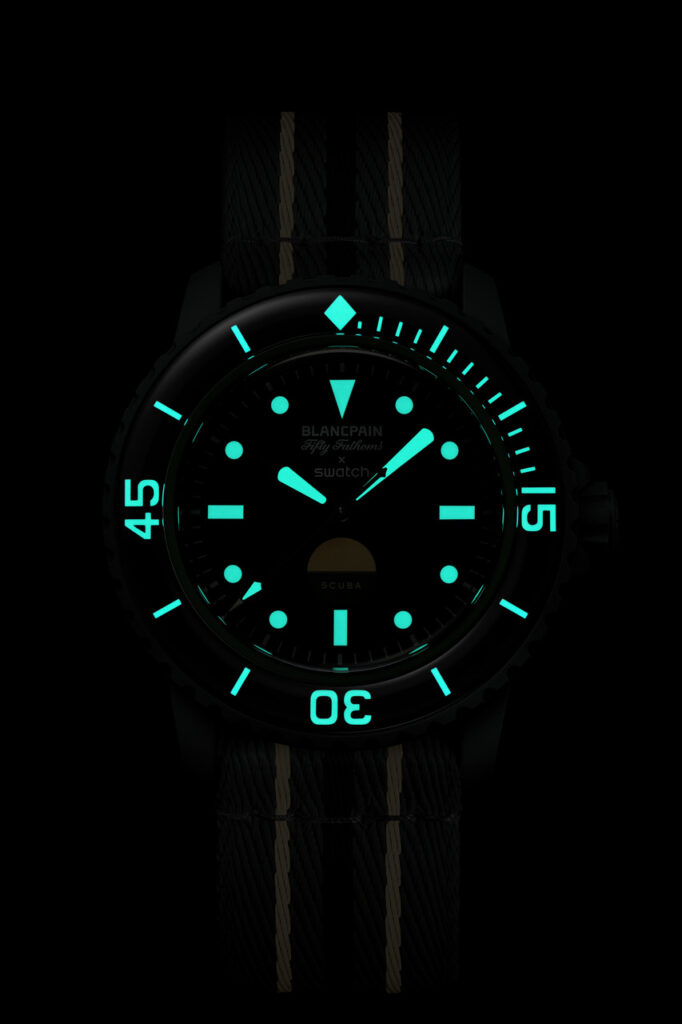 A palavra “Swatch” surge gravada no lado esquerdo da caixa, à semelhança da inscrição “Blancpain” nos modelos Fifty Fathoms originais. No fundo do relógio, encontram-se expressões inspiradoras como PASSION FOR DIVING, LICENCE TO EXPLORE, OCEAN BREATH, PROTECT WHAT YOU LOVE e IMMERSE YOURSELF.