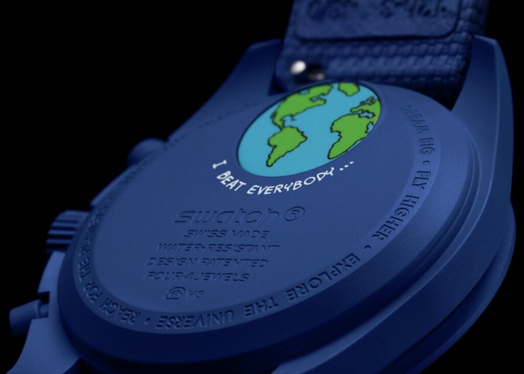 Os logótipos OMEGA X Swatch são orgulhosamente exibidos no mostrador e na coroa, enquanto a sua declaração de missão está gravada no verso da caixa. A tampa da pilha apresenta um design inspirado na Terra, enquanto a bracelete de borracha VELCRO® em azul-marinho acrescenta um toque de estilo à astronauta.