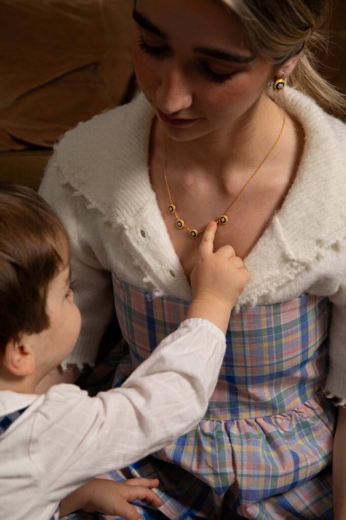 The centerpiece of the collection is a medal that breathes tradition: its edge is inspired by traditional Portuguese embroidery, and the lettering is handwritten. Available in 925 Silver and Silver with gold plating, the necklace allows between one and five initials to be combined, where each initial can represent a child, a family member, or the mother herself.